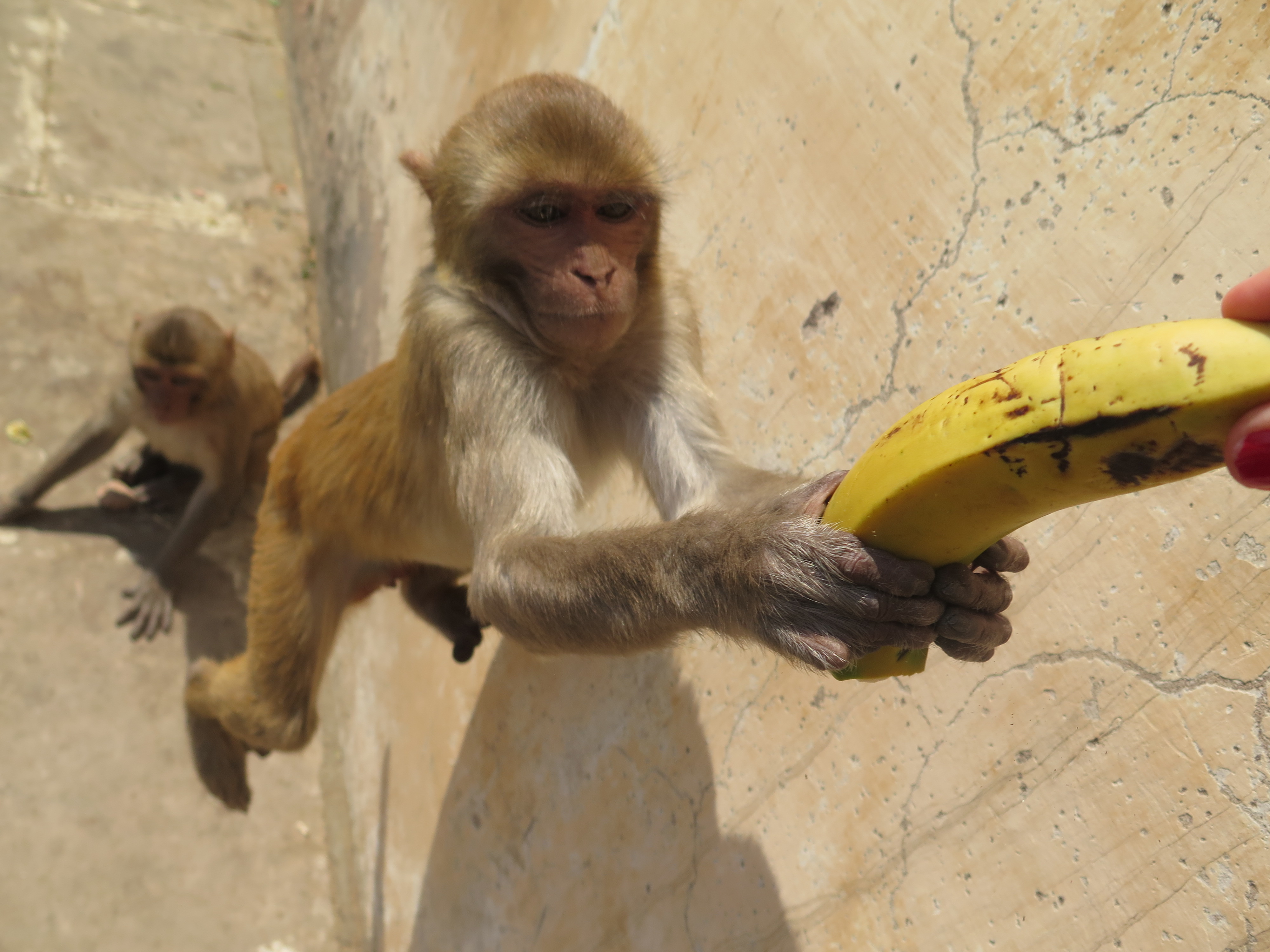 É um dos lugares que mais gostei em Jaipur. O templo é um pouco afastado da cidade então você precisa ir de carro. Chegando no templo compre umas bananas nas feirinhas ao redor do templo, porque la dentro você só vai encontrar amendoim para comprar e dar aos macacos. Custa em torno de 50 rúpias então vale a pena.